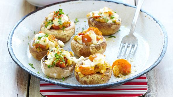 Šampinjone očistite pa im odrežite nogicu. Sitno ih narežite zajedno s rajčicama i lukom pa sve pržite na zagrijanom maslacu. Posolite, popaprite i pirjajte oko 6 minuta. Punite klobuke šampinjona pripremljenom mješavinom. Pospite izmrvljenim feta sirom i stavite na gril program u pećnici na 10 minuta da se zapeče. Izvadite šampinjone iz pećnice, pospite ih nasjeckanim vlascem te odmah poslužite dok su topli.