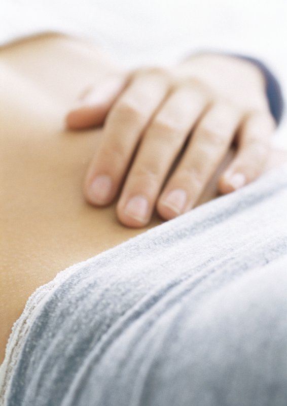 - Jednu ruku položite povrh druge i pomičite ih po trbuhu u smjeru kretanja kazaljke na satu: od desne strane zdjelice do rebara, pa na lijevu stranu trbuha, sve do lijevog kuka. Masirajte vrlo polako i nježno, jačinom koja vam odgovara. Ponovite 10 puta. Ako želite, koristite omiljeno hladno prešano biljno ulje.